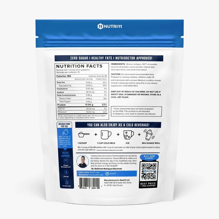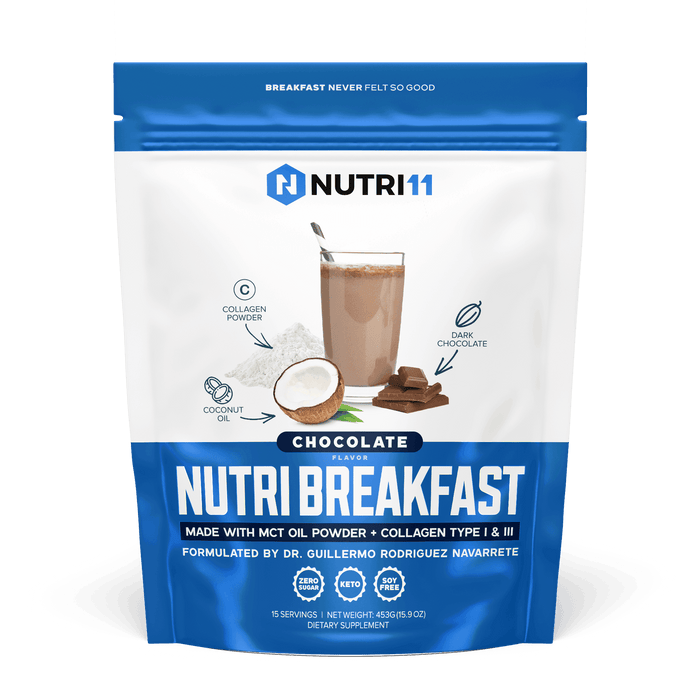 NutriBreakfast Chocolate del Dr. Guillermo R. Navarrete está enriquecido con ingredientes totalmente naturales como colágeno, chocolate amargo, aceite MCT, aceite de coco y más.