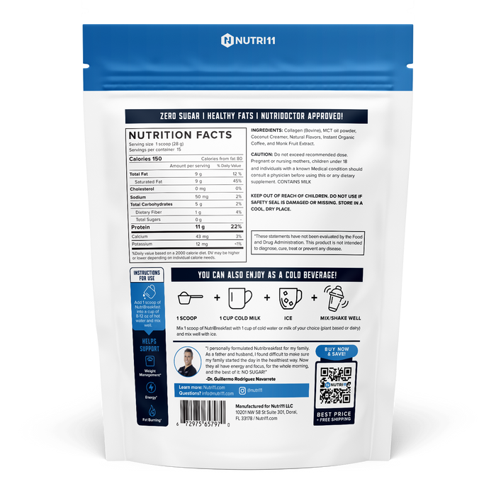 NutriBreakfast Coffee, la innovadora creación del Dr. Guillermo R. Navarrete, fusiona el placer del café con una poderosa fórmula nutricional. Enriquecido con ingredientes 100% naturales como colágeno, café premium, aceite MCT, aceite de coco y más.